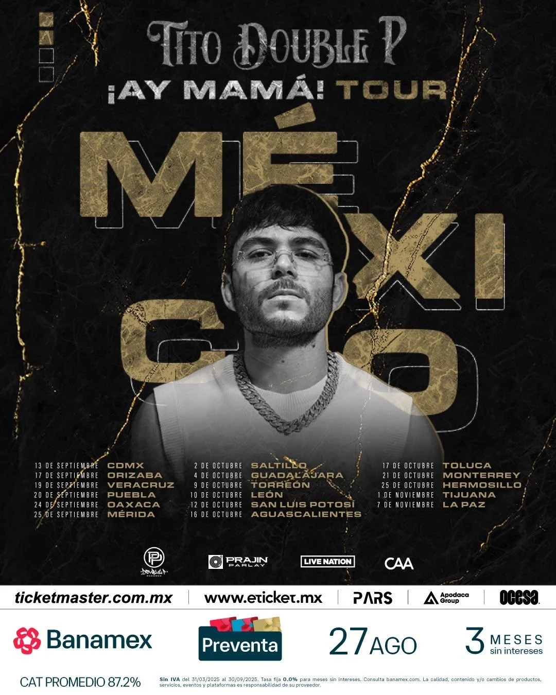 Con más de 22.6 millones de oyentes mensuales en Spotify y una creciente presencia en festivales internacionales, la gira ¡AY MAMÁ! de Tito Double P promete ser uno de los eventos musicales más destacados del año en México.